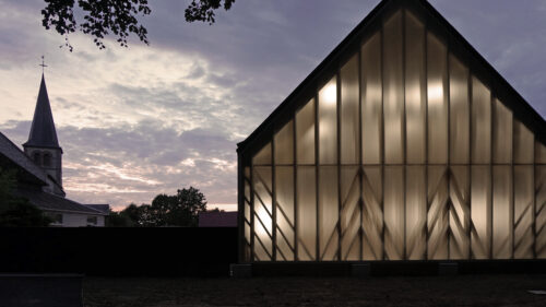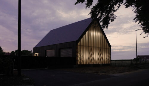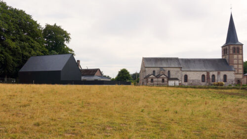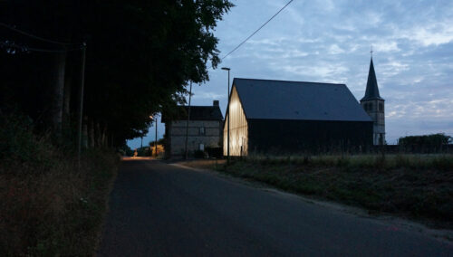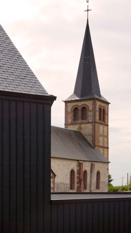 C’est un petit atelier municipal, juste de quoi y garer le tracteur de la commune, y installer l’établi du cantonnier et quelques rangements. Mais il se trouve que c’est un emplacement de choix qui lui a été déniché : en centre-bourg, à côté de l’église, en face d’un petit manoir et de son talus cauchois planté de hêtres. Alors, si petit soit-il, il va tout de même lui aussi grandement composer le paysage du village, et pour quelques temps.